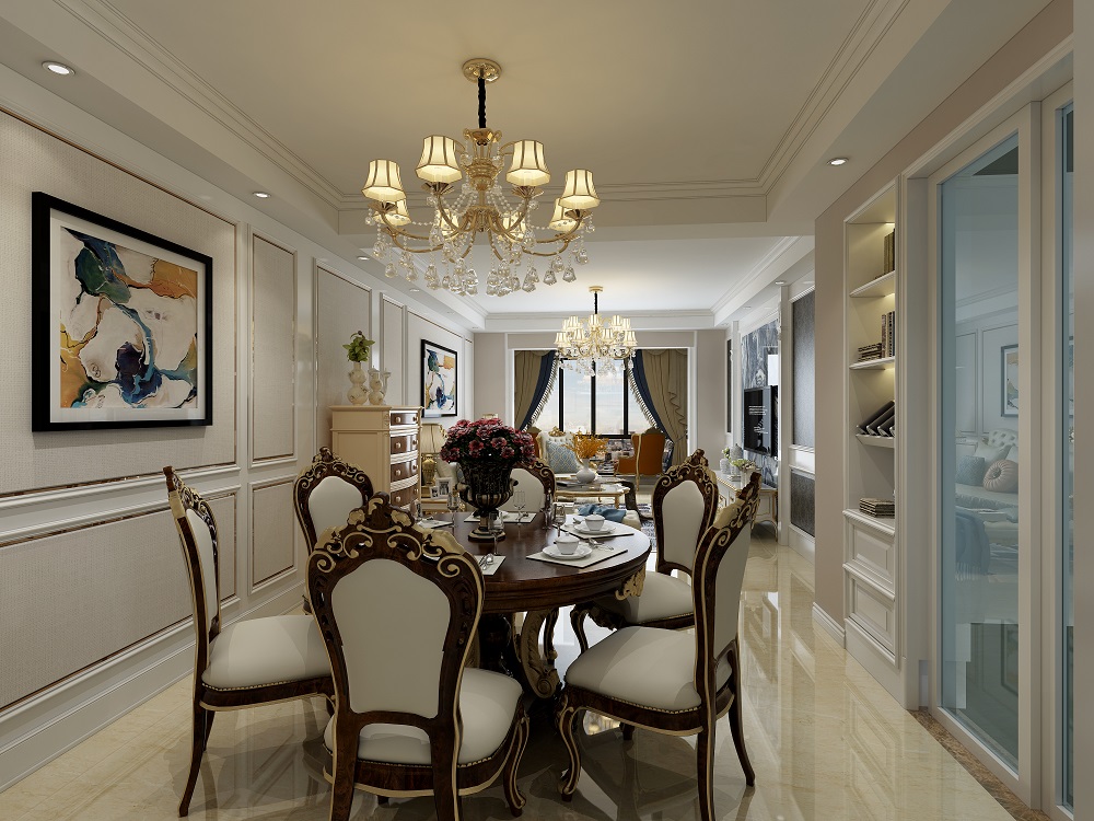 2021年12月3日-南宁创艺装饰。尚东御景采用的是具有浪漫异国风情的欧式风格设计,全房背景墙均用岩板和石膏线装饰,丰富且有层次感。客餐厅通过吊顶和家具划分区域,欧式雕花餐桌椅搭配豪华欧式水晶吊灯,构成一幅优雅大气的用餐环境。客厅水晶石背景墙色泽显档次,是客厅的点睛之笔。