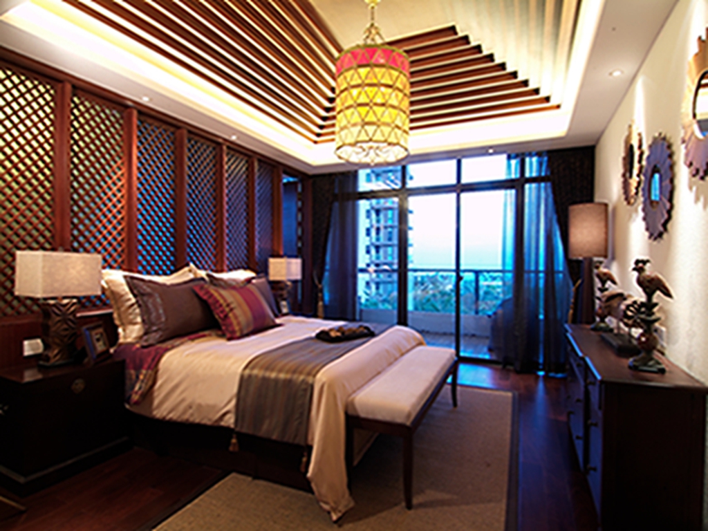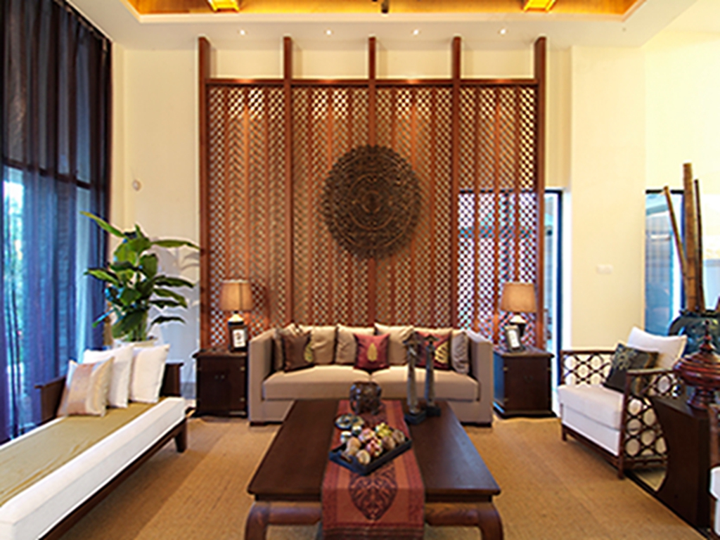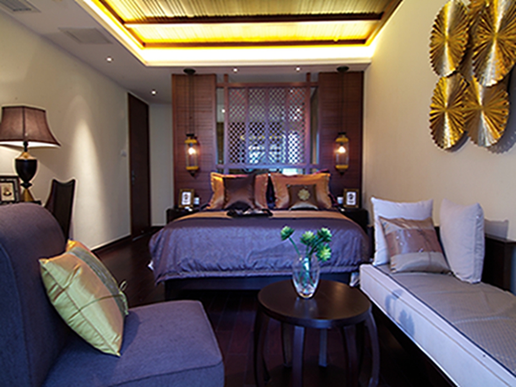 【大理创艺装饰】东南亚风格,采用当地民族特色以及精致文化的设计方式,适合喜欢静谧、文化修养较高的成功人士。广泛地运用木材和其他的天然原材料,如:藤条、竹子、石材、青铜,深木色的家具,局部采用一些金色的壁纸、丝绸质感的布料,灯光的变化体现了稳重及豪华感。