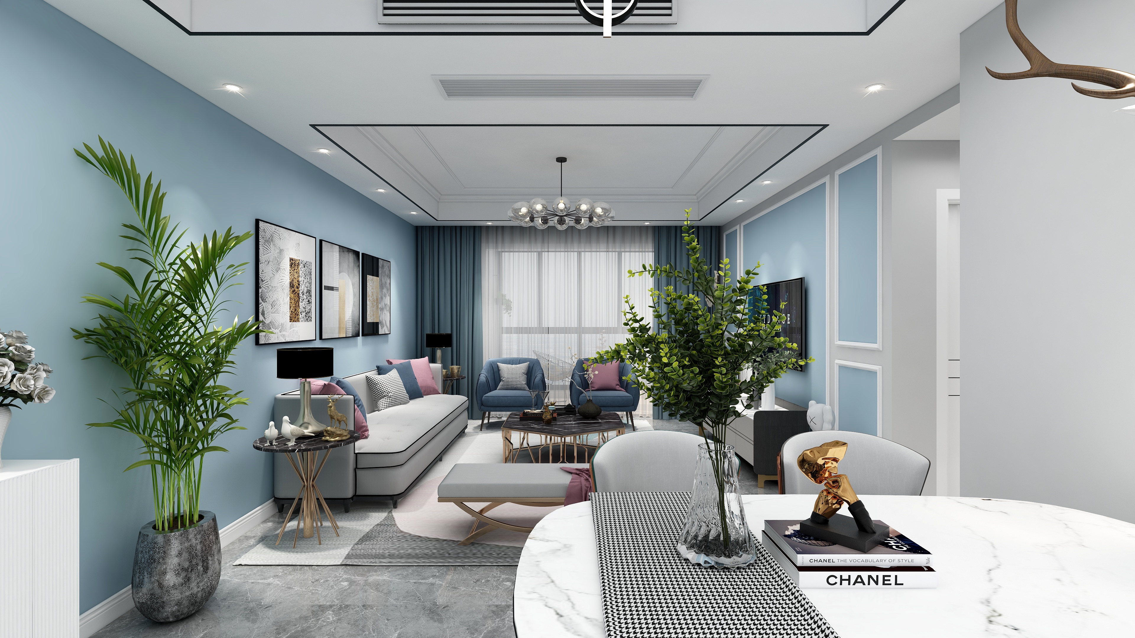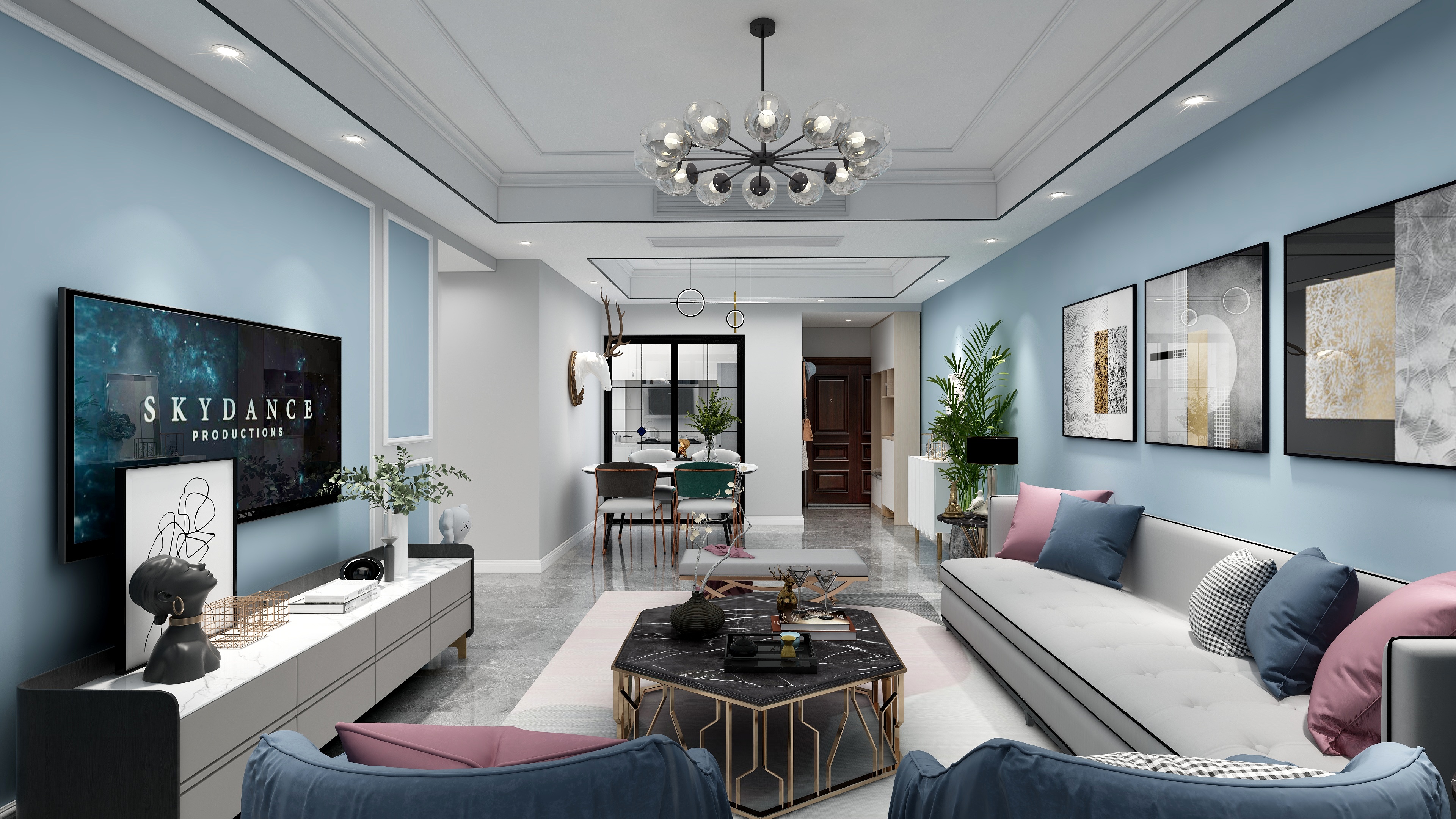 2020年9月28日-【遵义创艺装饰cy1997】本案是遵义天奇港湾国际89平米的现代风格装修效果图。本案设计师运用了蓝色和白色为主色,搭配灰色和粉红色的软装,给人眼前一亮的感觉,既时尚又温馨。