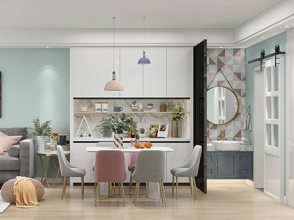2021年5月24日【合肥陵创艺装饰cy1997】这套春江紫宸90平米北欧风格的装修案例,墙面色彩主要以翠绿色为载体,显得格外清爽温馨。洗漱盆与餐厅之间做镂空隔断设计,既方便生活也增添美观。