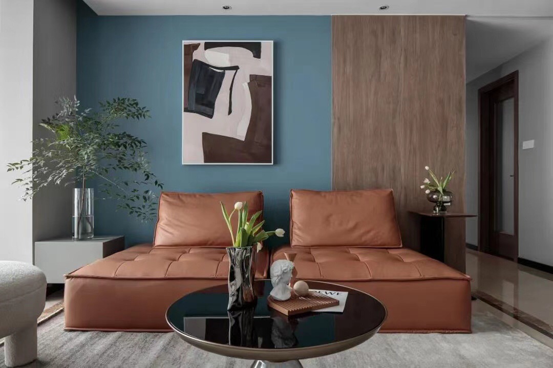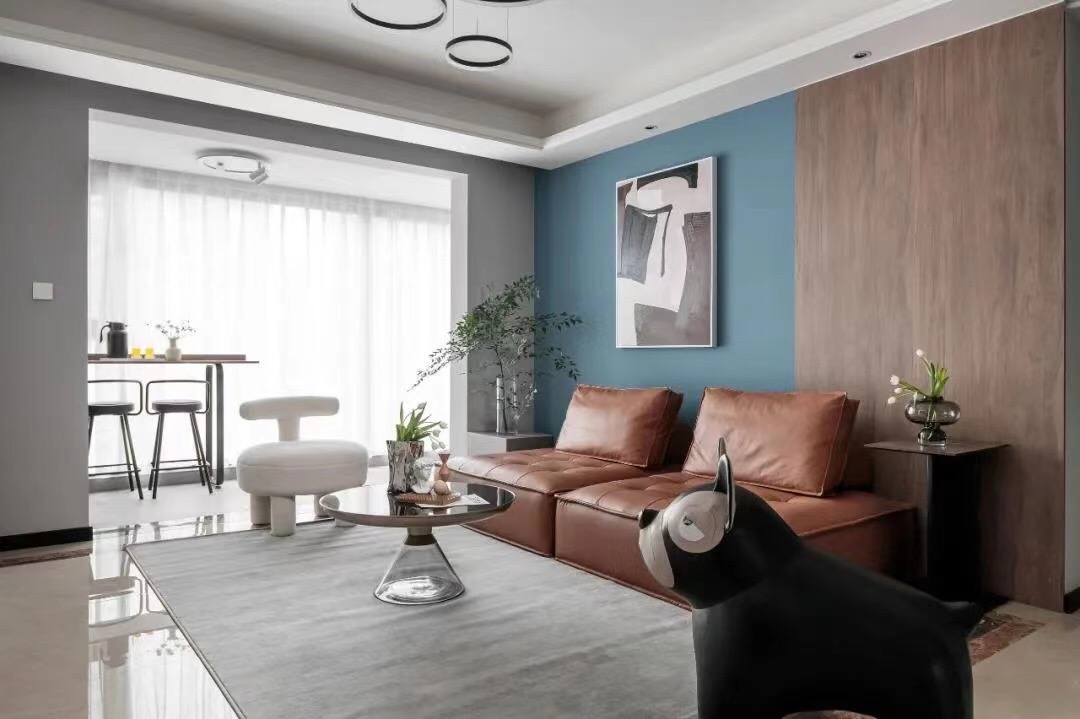 2021年8月10日-曲靖创艺装饰;颜色的碰撞,皮革与金属材质打造轻奢风格居住空间;软装设计中每一个物件都是空间的亮点大胆的使用桔色来做沙发的主色调,也作为整个空间的提亮色,白色的圆形沙发和小狗沙发柔和空间中金属和皮质材质的冷硬,更活泼明朗