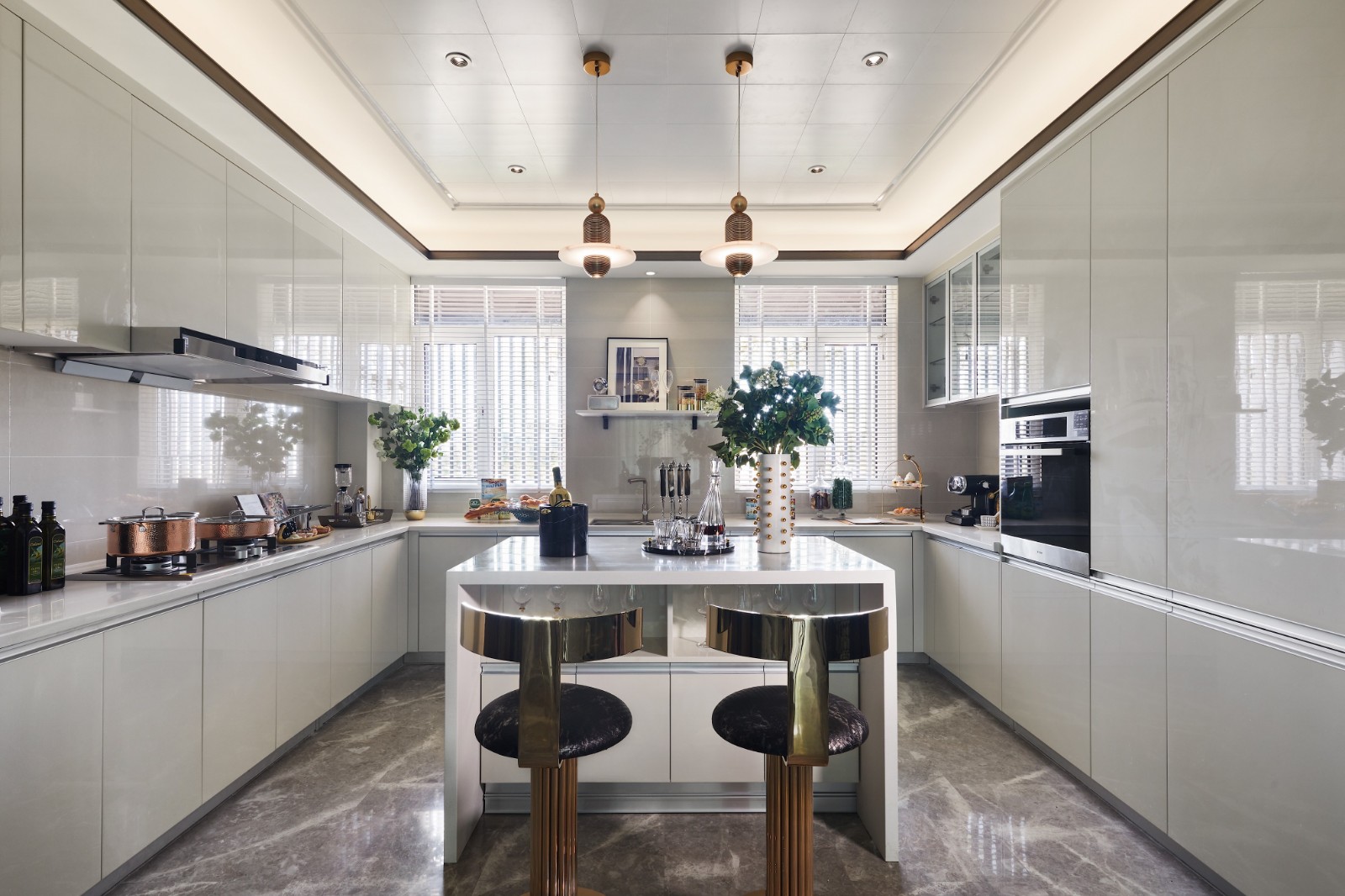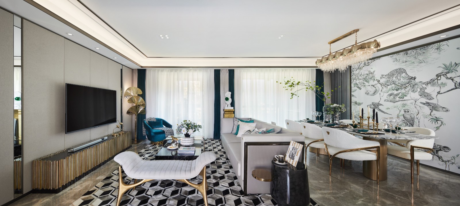 2021年8月27日-曲靖创艺装饰;客厅与餐厅的链接,挥洒出大平层合纵连横的大气。全局以黑白色系经典色为主,金色勾搭出了整体装修风格精致摩登的复古气息;现代风格与端庄高贵完美融合,细节处处彰显格调。