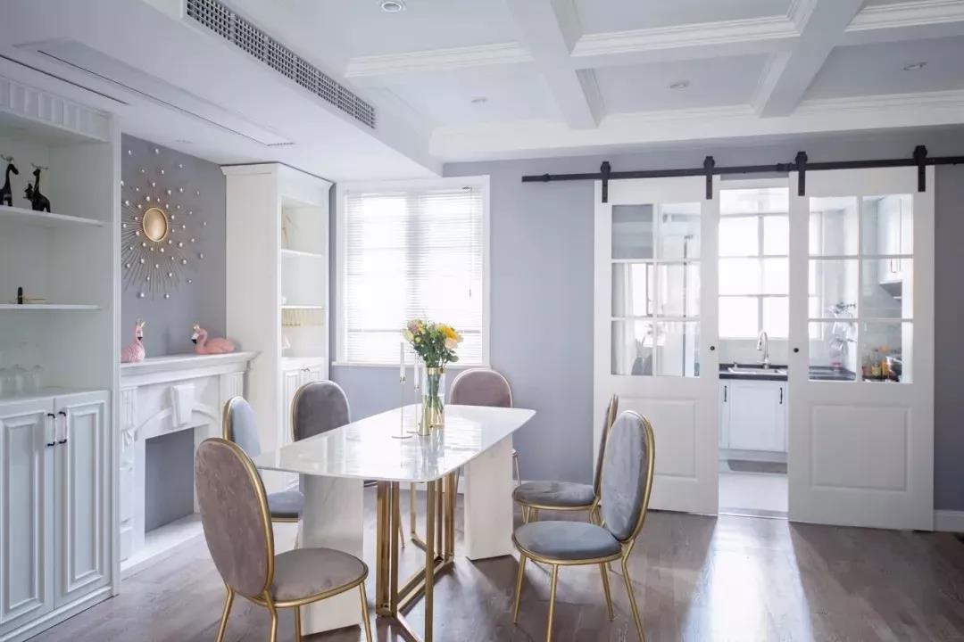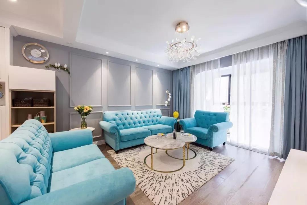 2021年11月19日-蒙自创艺装饰 今天为大家分享的是一套面积120㎡的三居室装修案例,女主人坚持选择美式装修,并用Tiffany蓝搭配高级灰,打造出一个精致又清爽的居家空间,丝绒家具以及壁炉造型,营造出浓郁的美式风情,精致感满满,给人十分高级的感觉。