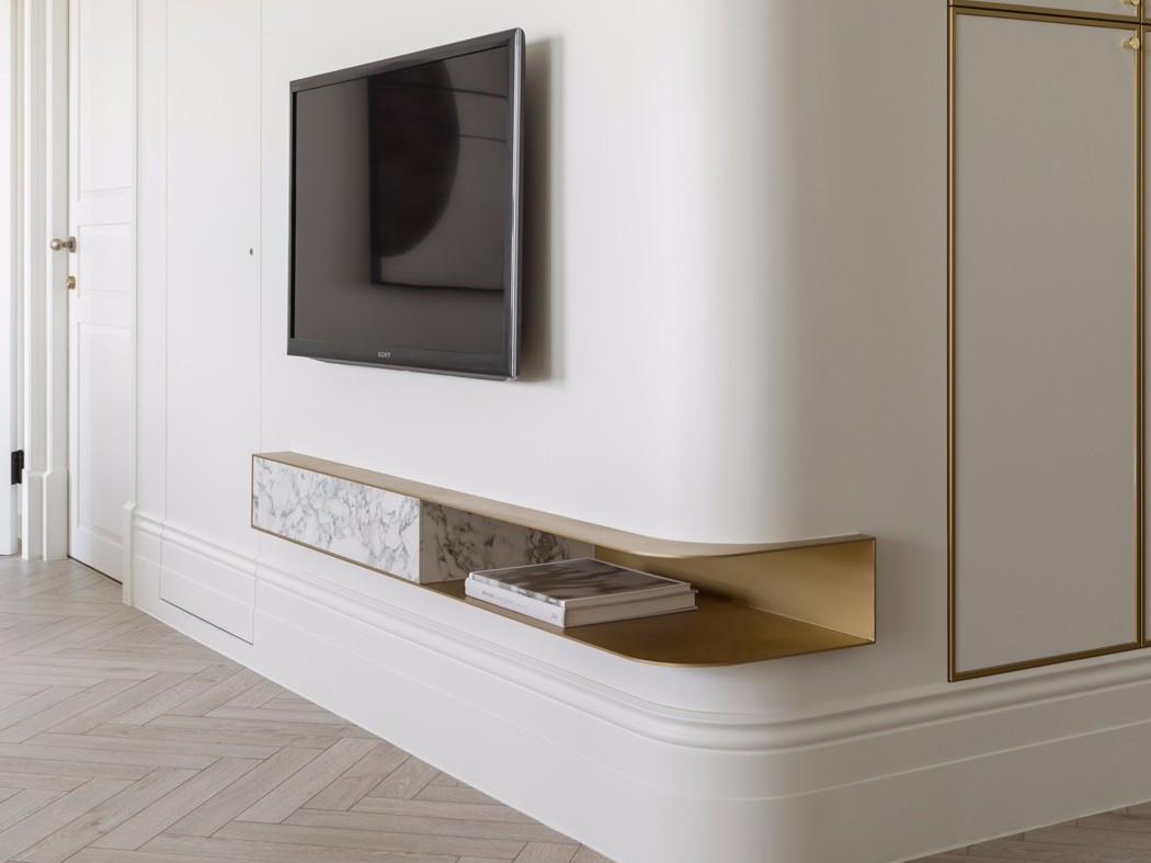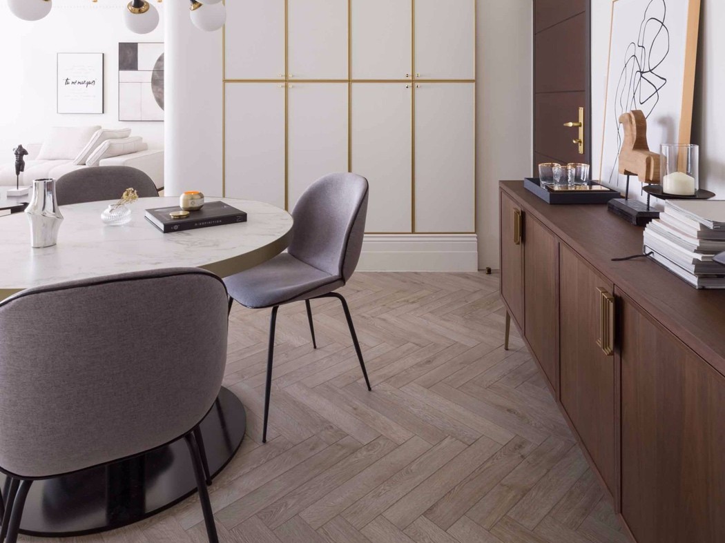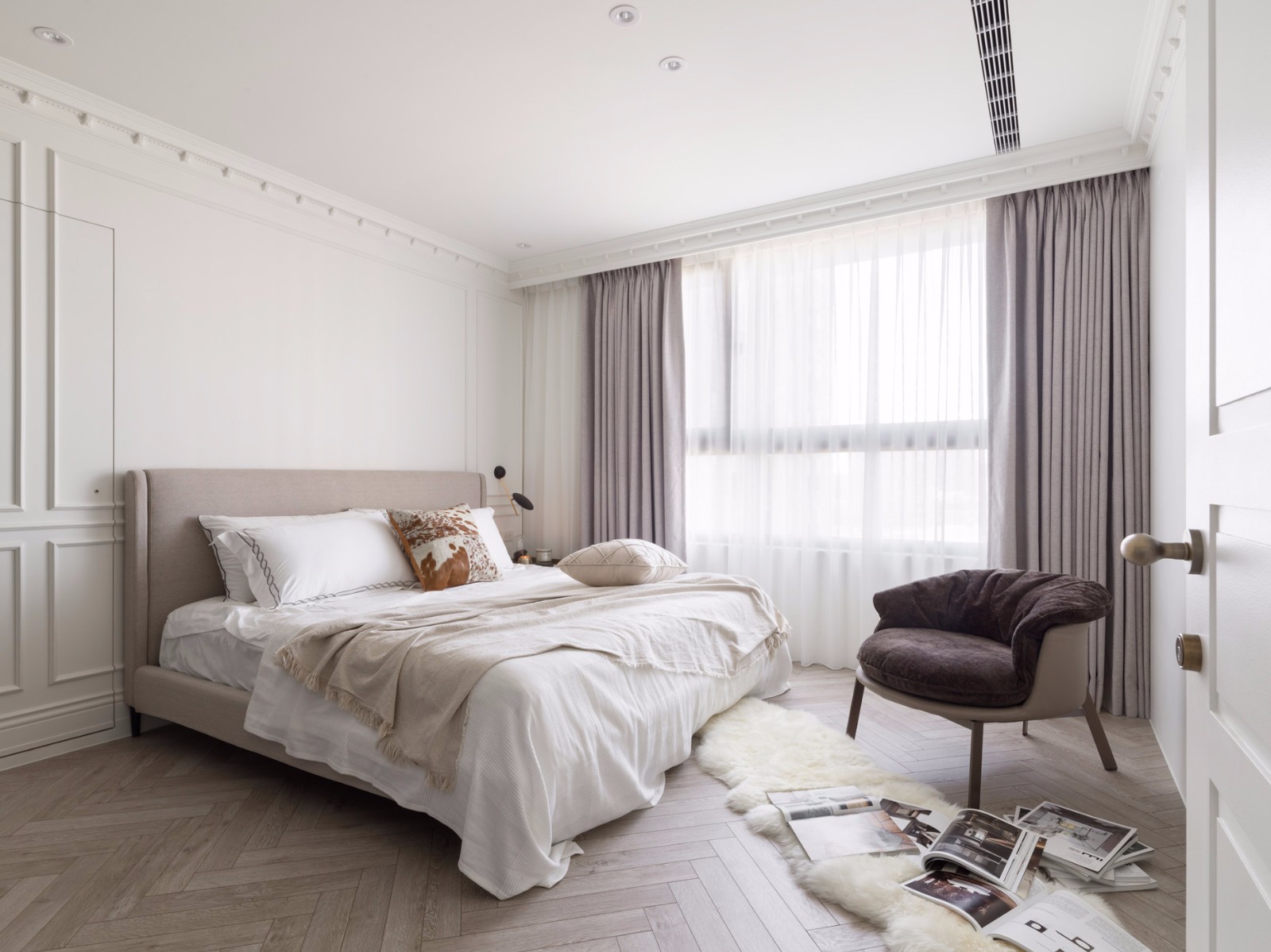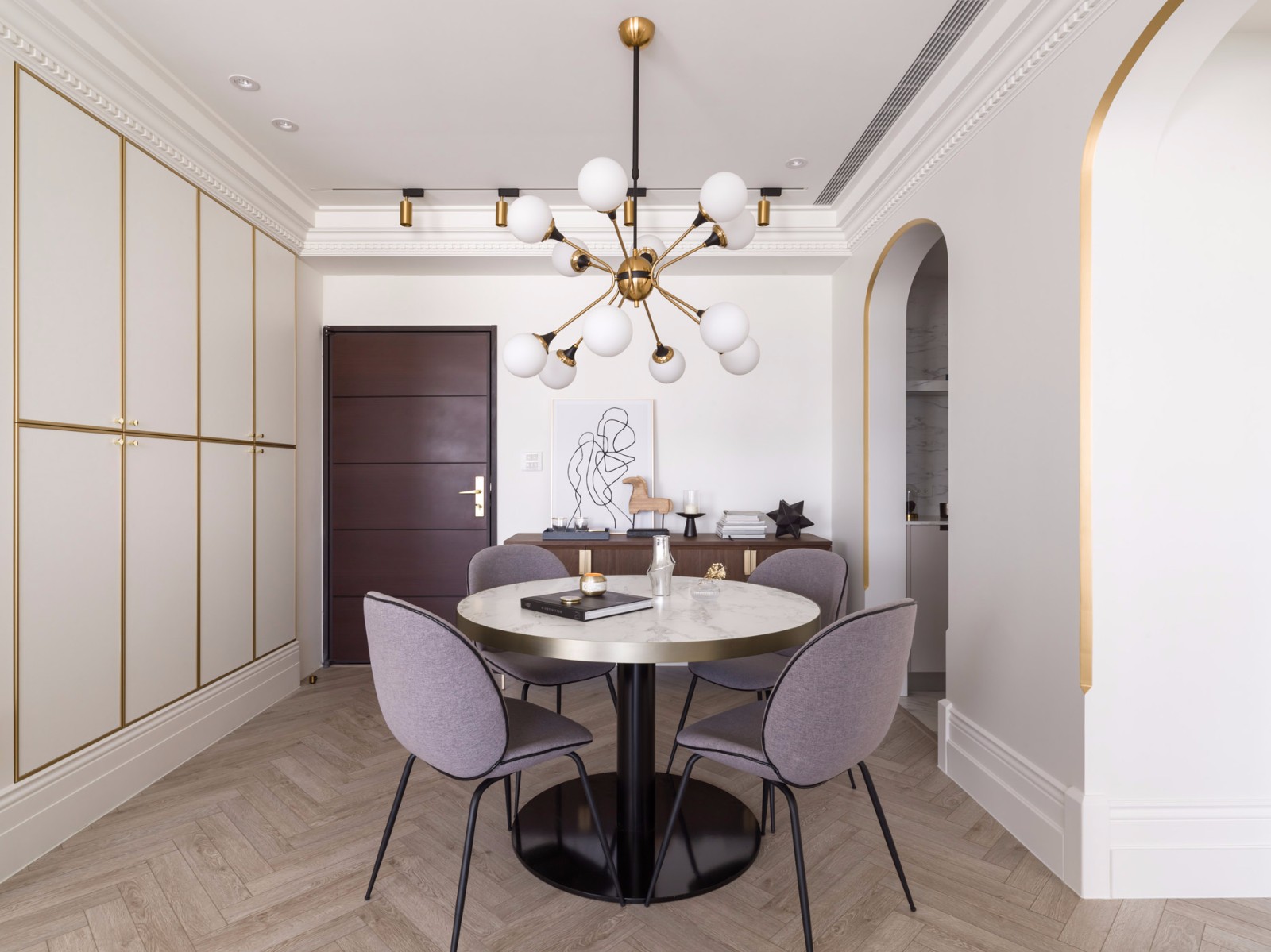 2021年9月16日-曲靖创艺装饰;透过人字拼木地板、典雅线板、圆润弧度与黄铜线条再现经典韵味,同时以欧美现代家具进行诠释,精炼出永恒不凡的美式居家品味,简净暖白基调,悉心衡量天花尺度,拣选精巧别致的雕花线板阐释细腻气质,调和出舒适空间比例。