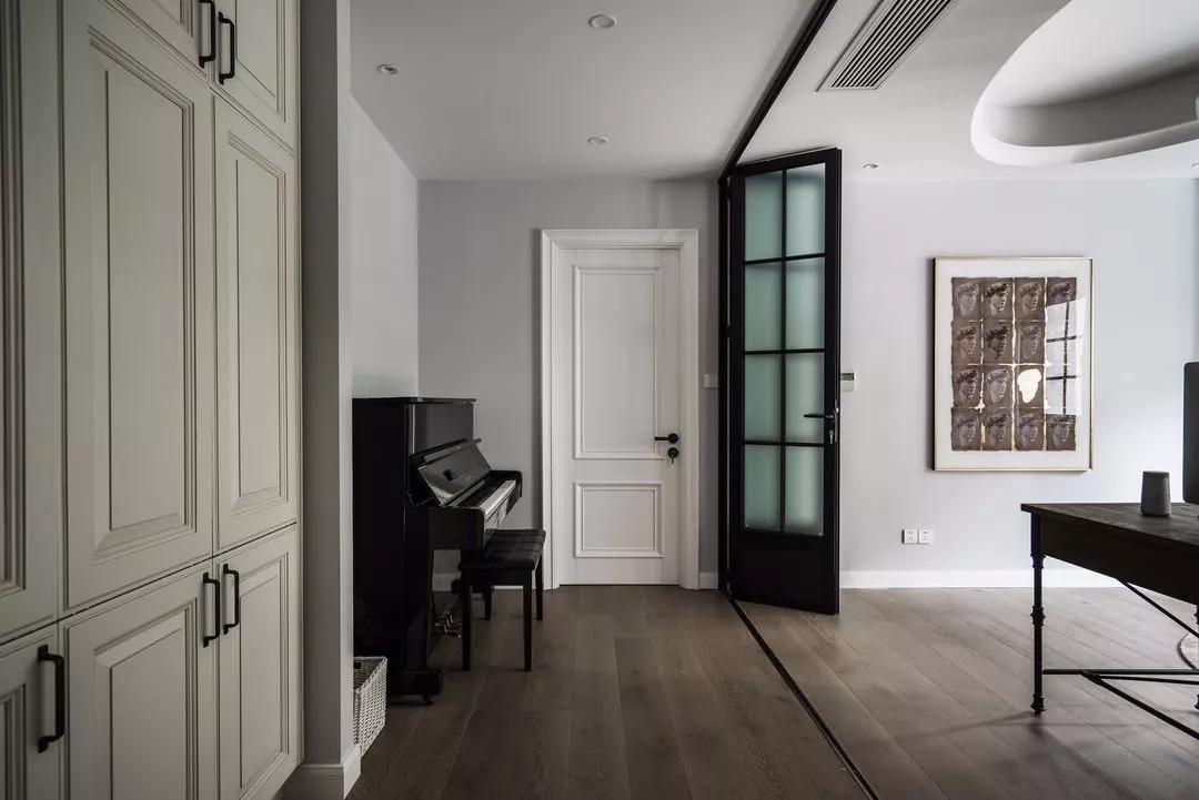 2021年11月5日-曲靖创艺装饰;大面积的藏蓝色运用在墙面,极具个性,金属框沙发自带高冷气质,多了些克制且冷静的工业感,搭配大红沙发椅做点缀,让空间刚柔并济;钢琴区与书房空间结合,设置折叠推拉门可将空间独立开。